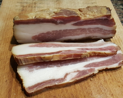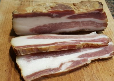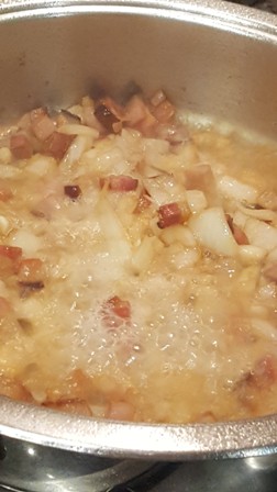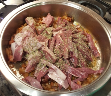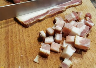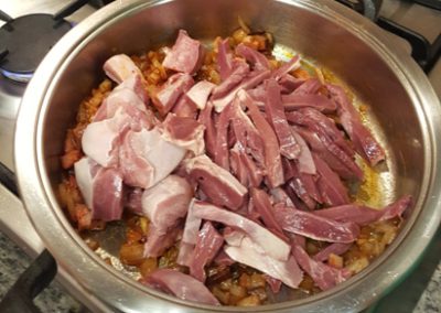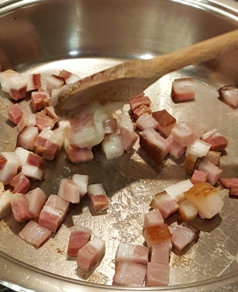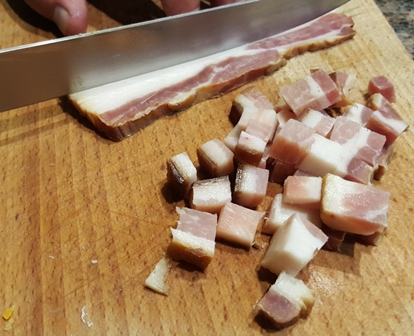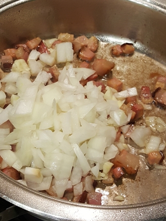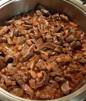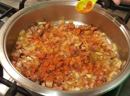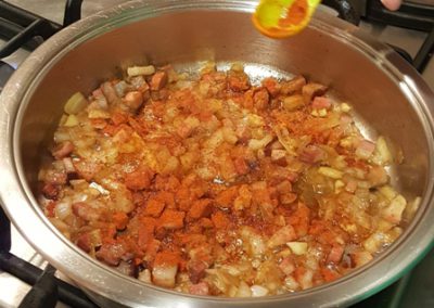 A füstölt szalonnát felkockázzuk (1,2), a hagymákat felaprítjuk (3). A szalonnát zsírjára pirítjuk (4). Hozzáadjuk a hagymát (5), – és most figyelj, nem csalok! – a könnyebb emészthetőség érdekében, és hogy a szaft testesebb legyen, hűtő hideg szénsavas ásványvízzel (6) minimum kétszer, de jobb háromszor, a korábban üvegesre pirított szalonnás, hagymás egyveleget felöntjük, és zsírjára visszapirítjuk (7). Rászórjuk a pirospaprikát (8), összeforgatjuk, és a felaprított belsőségeket rádobjuk (9), fűszerezzük (10), újra megforgatjuk, és készre főzzük (11). Ha szükséges kevés szénsavas ásványvizet öntünk alá. A velőrózsákat a tojássárgájával összeturmixoljuk, és a kész étellel összeforraljuk mindaddig, amíg a szaft be nem sűrűsödik.