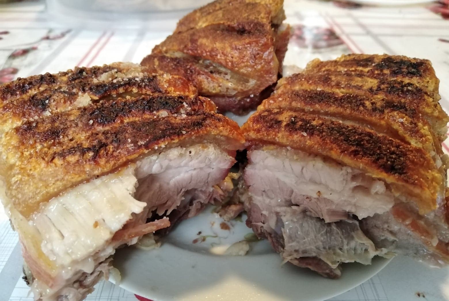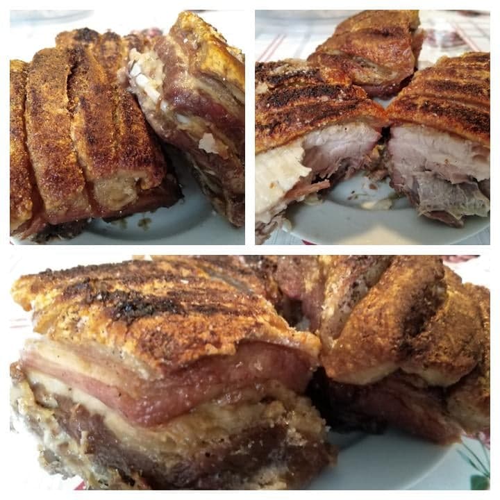 A tepsit alufóliával kibéleljük, kevés zsírt teszünk alá, majd belefektetjük a húst bőrrel felfelé, és a durva szemű sóval vastagon betakarjuk a bőrt. (Ne sajnáljuk, és ne féljünk, nem lesz sós! Ennek az a funkciója, hogy elvonja a bőr víztartalmát.)