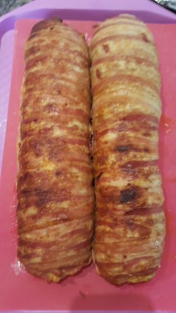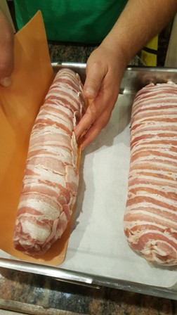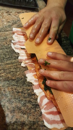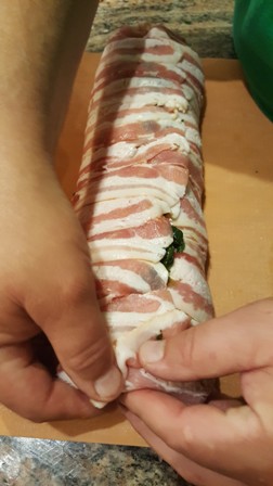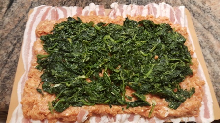 A szalonnaszeleteket-egymást fedve kiterítjük, ráterítjük a darált húst, majd a spenótot (5), és ügyesen feltekerjük (6,7,8,9). Fólia alatt kb. 45–50 percig sütjük, aztán levesszük róla a fóliát, és pirítjuk a kívánt szín eléréséig (10).