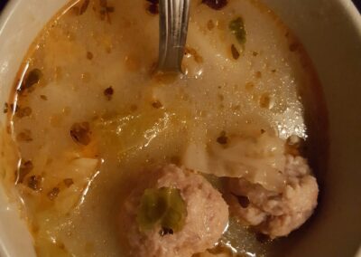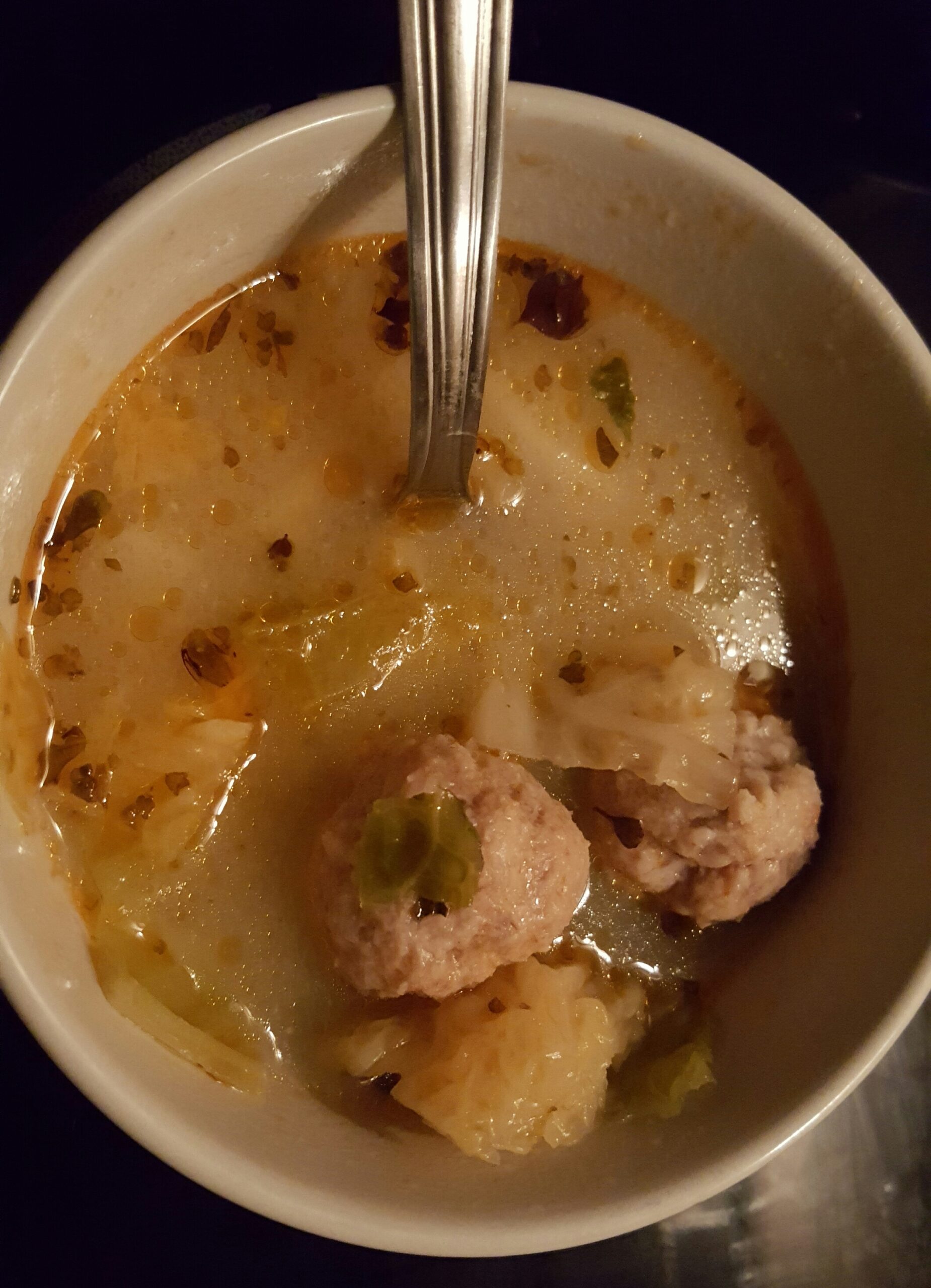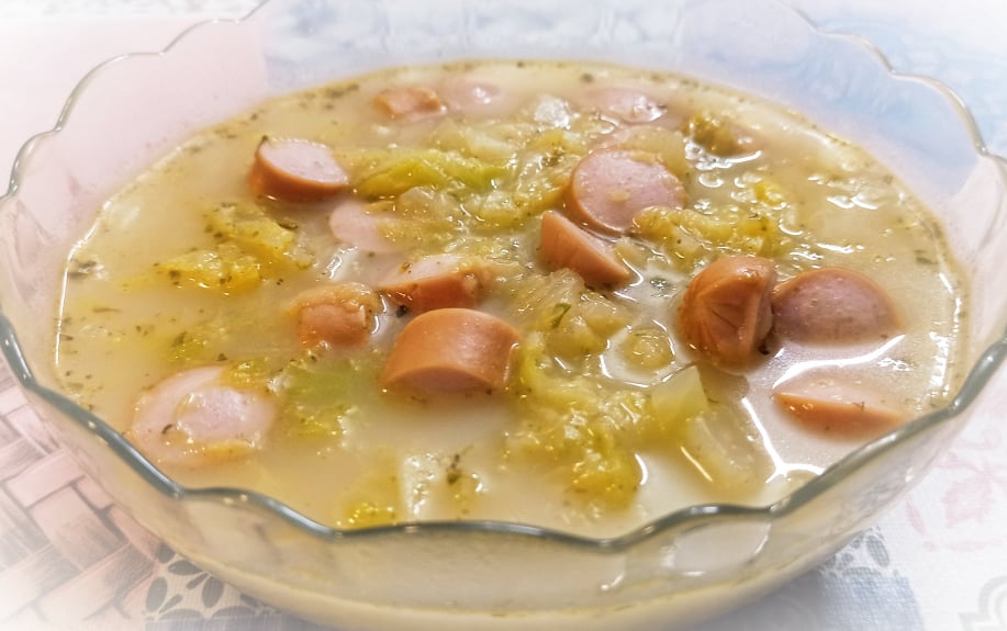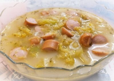 A kelkáposztát felszabdaljuk. Ha a húsgombócos változatot választjuk, akkor a darált húst beízesítjük sóval, borssal, pirospaprikával, belekeverjük az 1 db tojást is. Szerecsendió is jöhet bele pici. Zsíron, összeaprított hagymán az apró kockákra vágott karalábét átforgatjuk, majd rátesszük a kelkáposztát is. Sózás, borsozás után megszórjuk majoránnával, majd amikor a kicsit összefonnyadt, felengedjük kb. 2 l vízel. 15 -20 percnyi főzés után, óvatosan belehelyezzük a diónyi gombócokat, és készre főzzük. A húsgombócokat virslit is helyettesítheti.