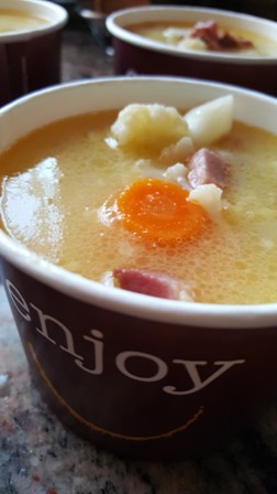 1 EK zsíron a felaprított hagymát a felkarikázott répákkal megdinsztelem, majd ráteszem a rózsáira szedett karfiolt, és fűszerezem. Kevés vízzel, éppen ellepje felengedem, majd puhára főzöm. Kiveszek 4 karfiolrózsát, néhány karika sárgarépát, kevés pirospaprikával megszórom és botmixerrel pépesítem. Amíg ezt csinálom,felengedem a fagyasztóból kivett sonkalével (semmi baj, ha nem vettem ki előző este, hamar felolvad), majd a karfiolos péppel besűrítem a levest, és még egyet rottyantok rajta.