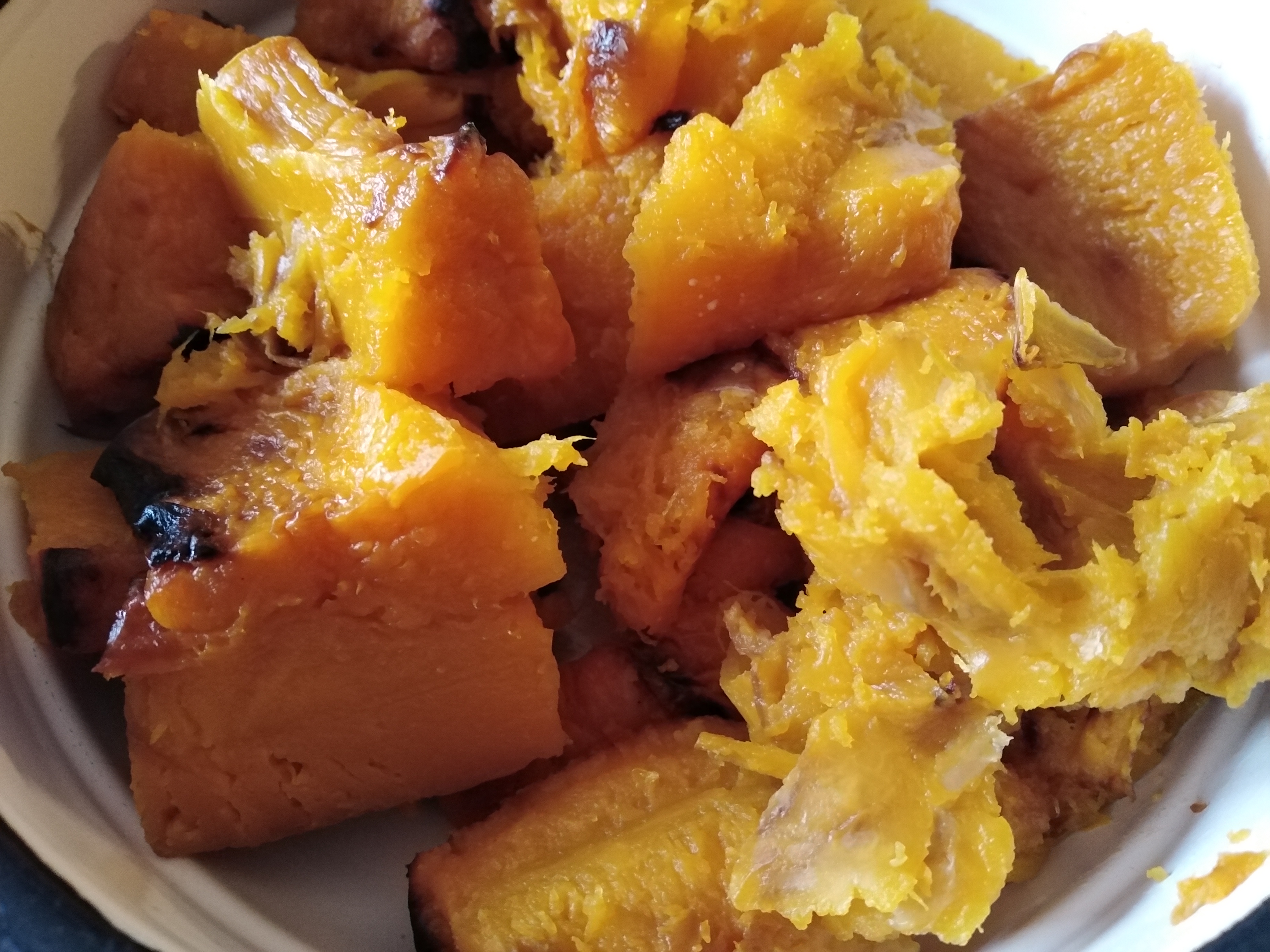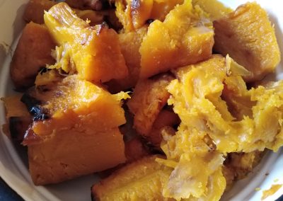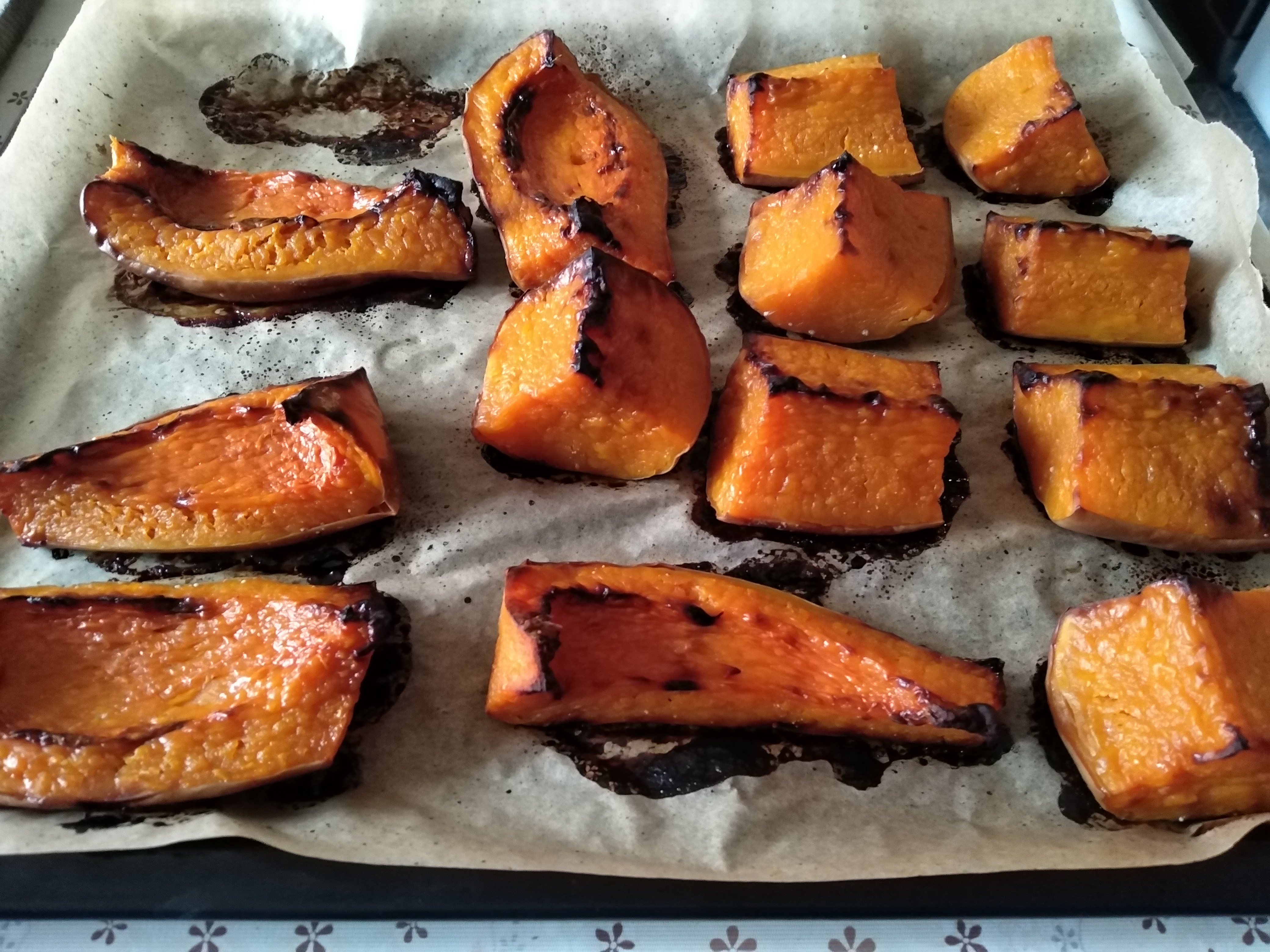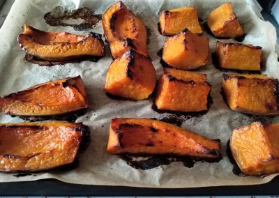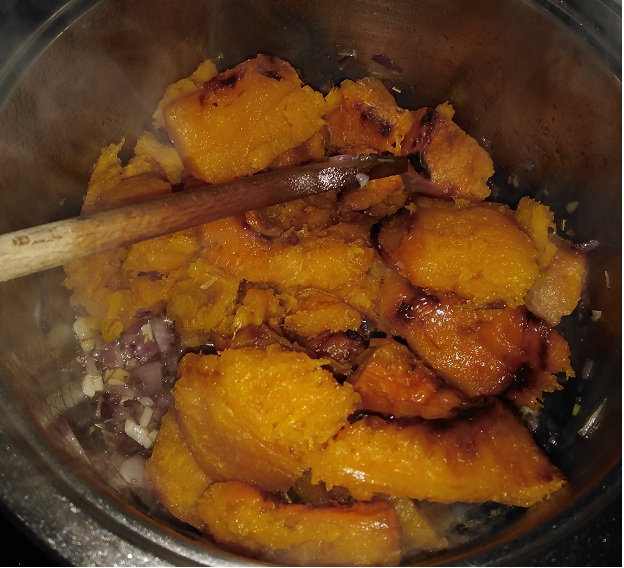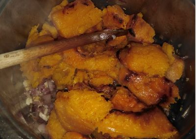 A sütőtököt megmossuk, magjait eltávolítjuk és feldarabolva 200′ kb. 1 óra alatt megsütjük (1). Amikor kihűlt, a héjáról lekaparjuk (2). Ezt a műveletet én előző este elvégeztem.