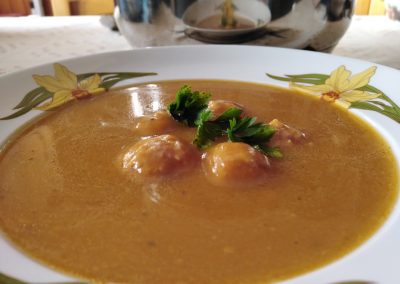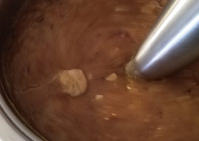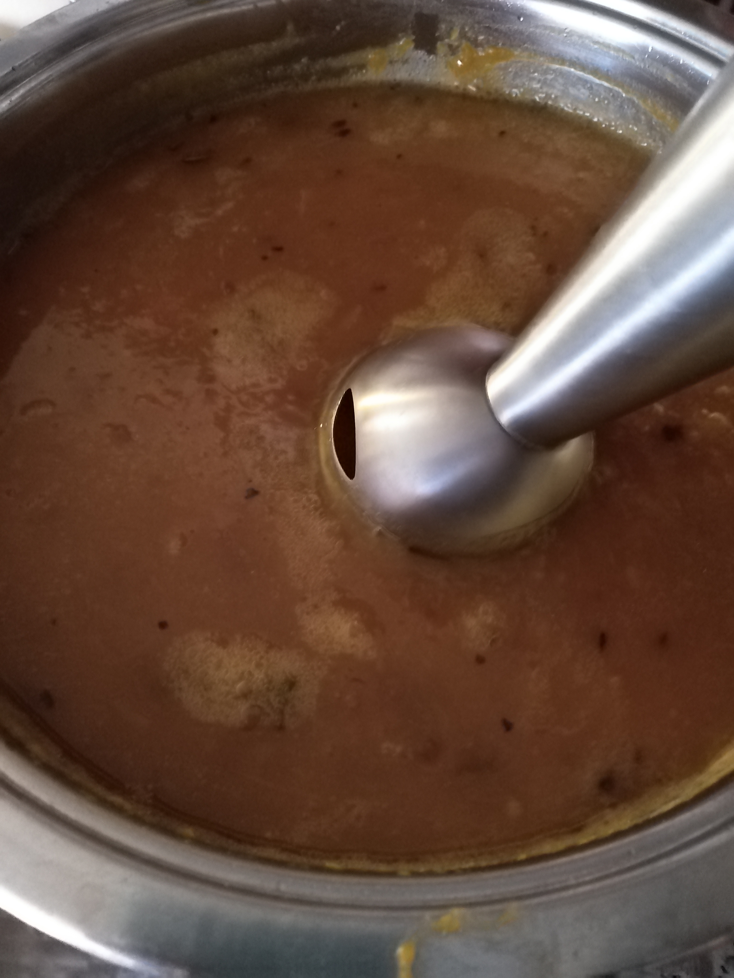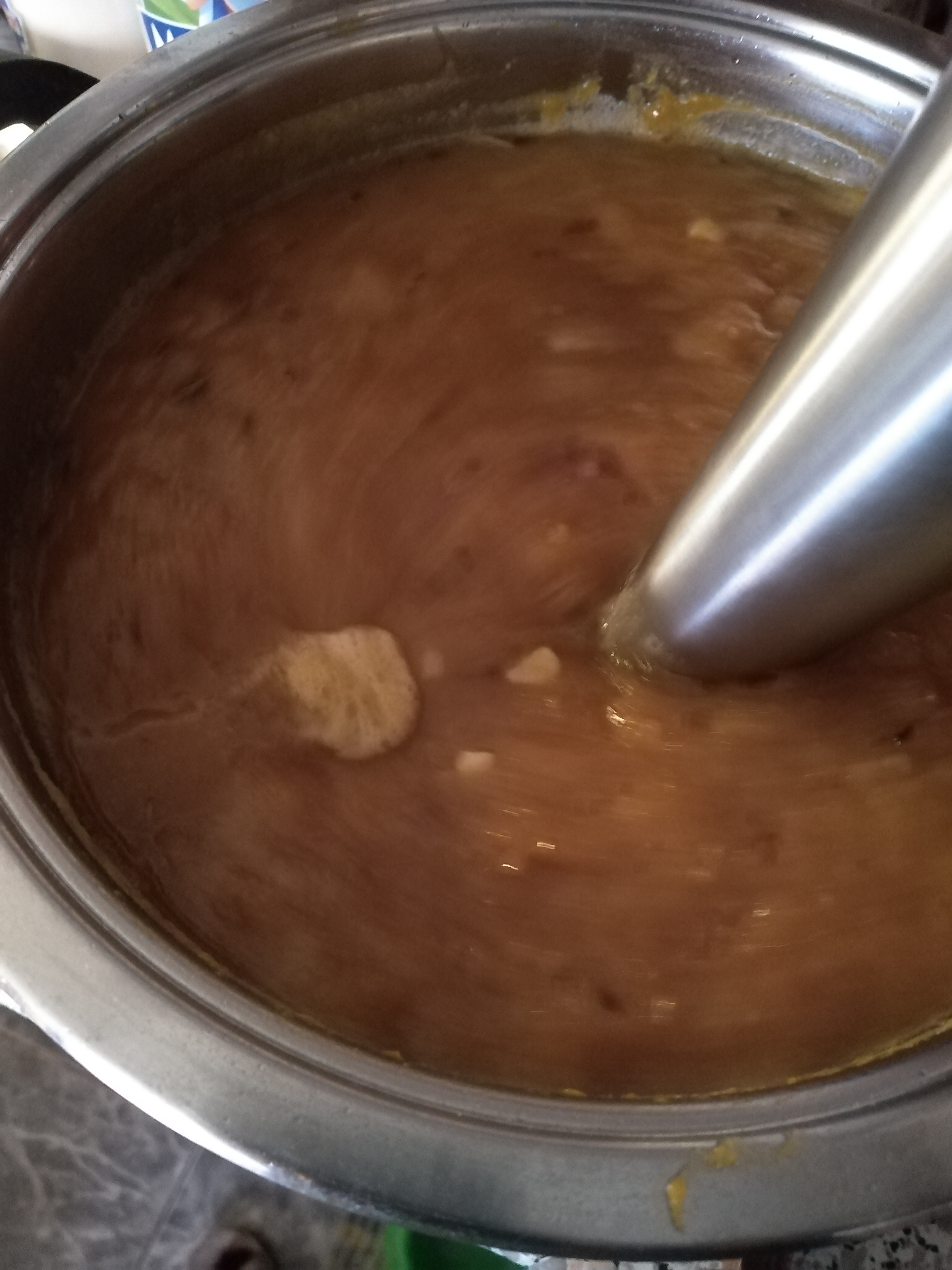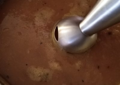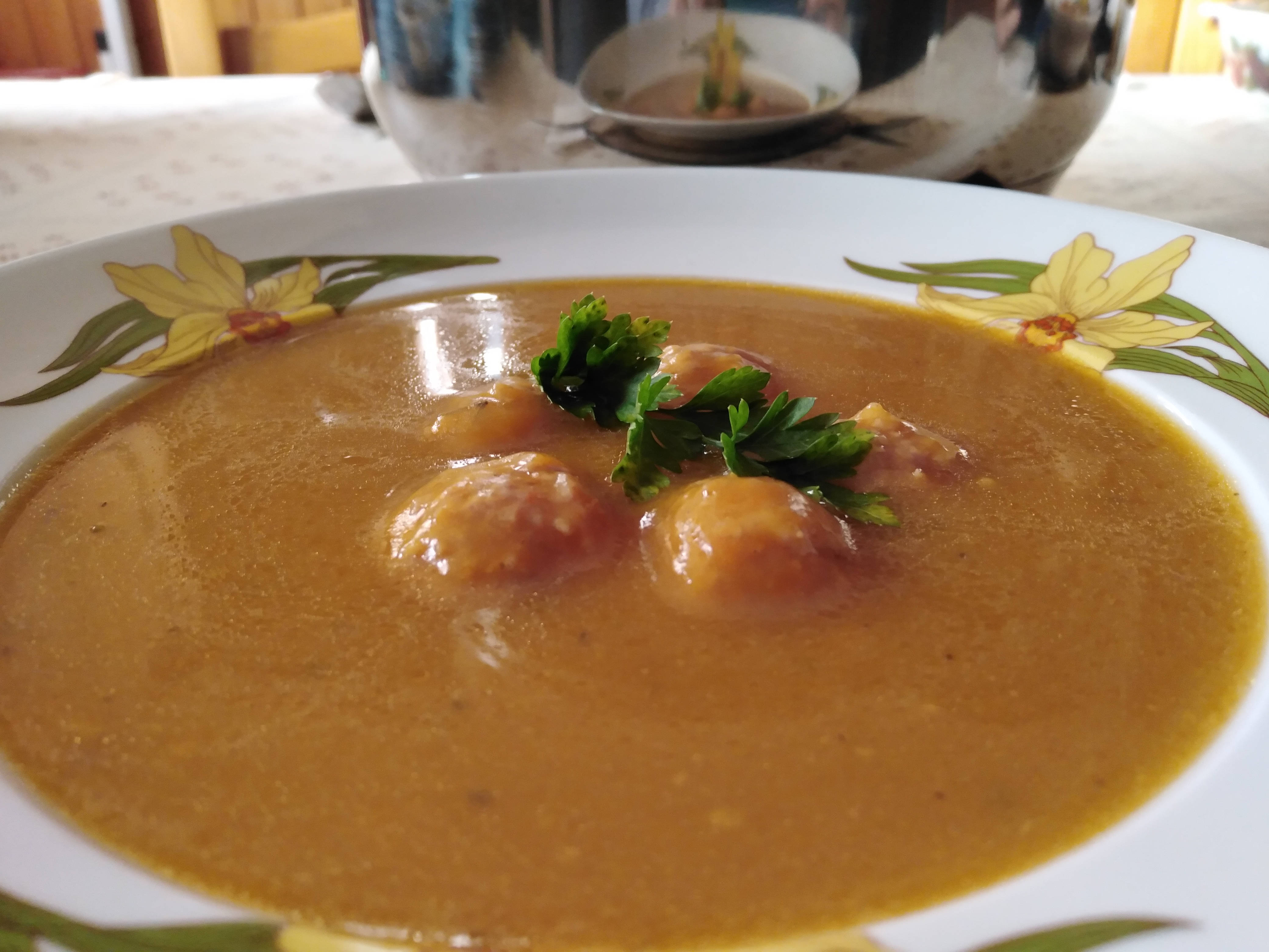 Mivel a tök már meg volt sülve, csupán kissé össze kellett forrnia az ízeknek. Ezek után egy botmixer segítségével, vagy turmixgéppel átdolgozzuk (11, 12), majd óvatosan beletesszük a golyókat, és kb. 10 – 12 perc alatt készre főzzük (13).