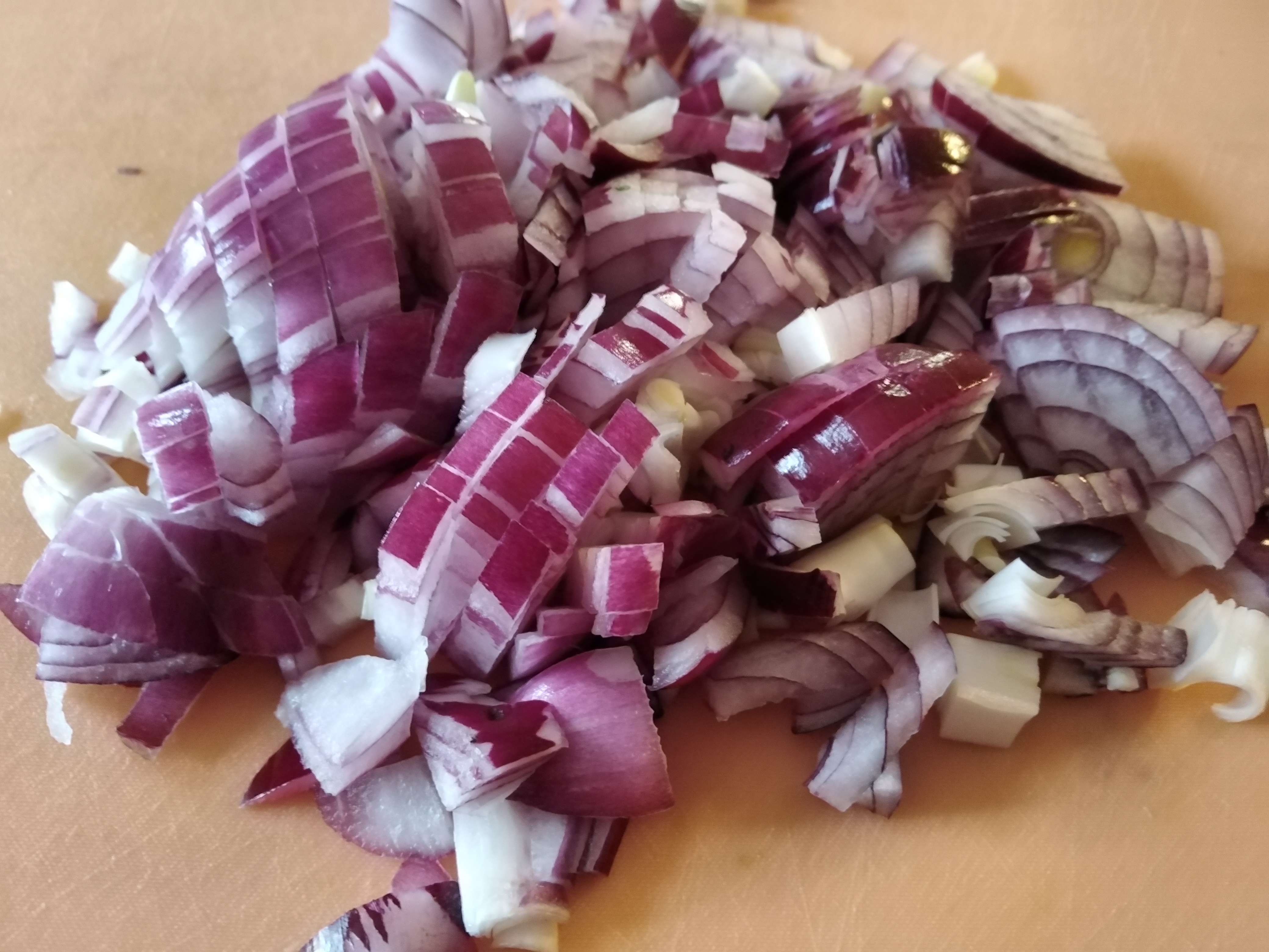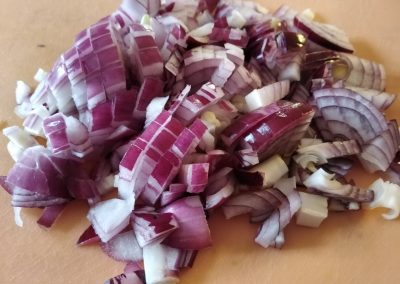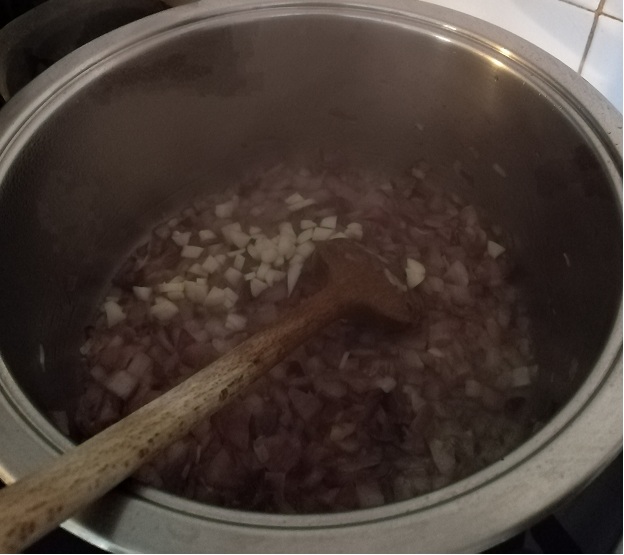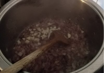 A lilahagymát felaprítjuk (3, 4), majd 1 EK zsíron üvegesre pároljuk (6), utána a fokhagymát is rádobjuk (5). A zsályából kb. 1 csapott evőkanálnyit teszünk a hagymára (8), majd a sütőtökkel összeforgatjuk (9). Kb. 3 l vizet öntünk rá, persze a sót, borsot nem hagyjuk ki.