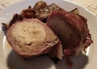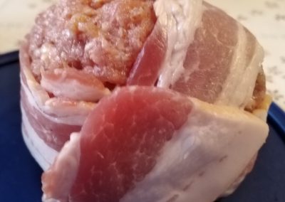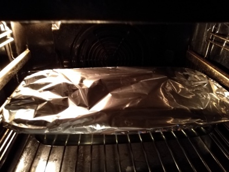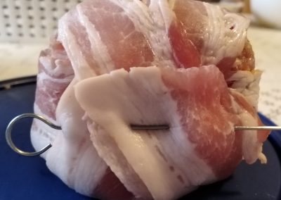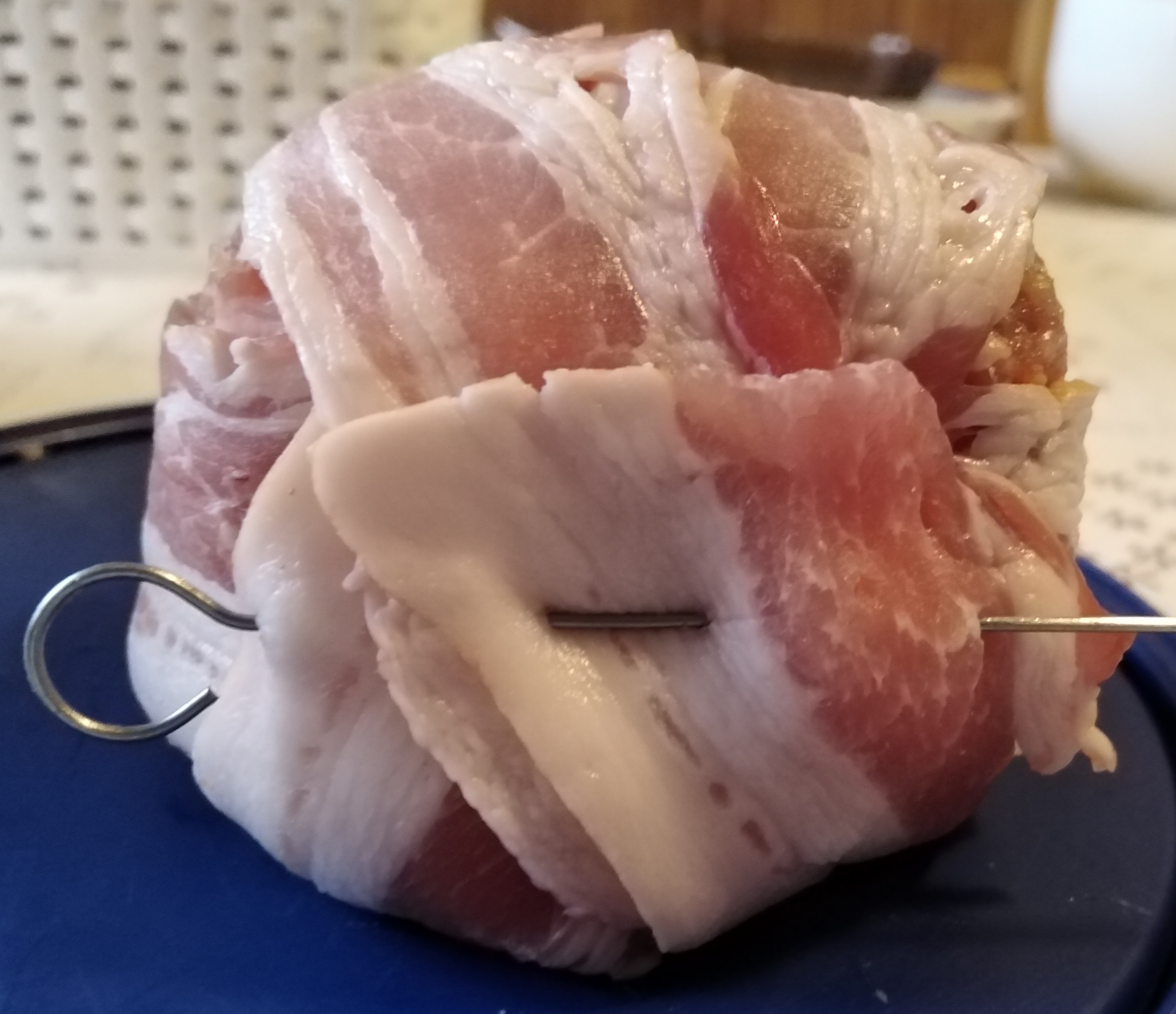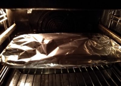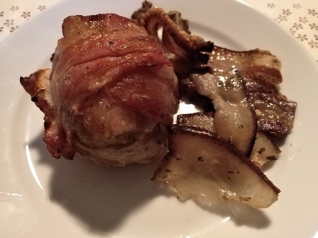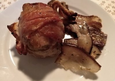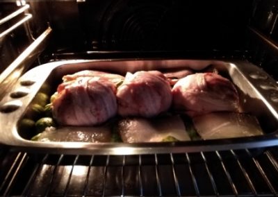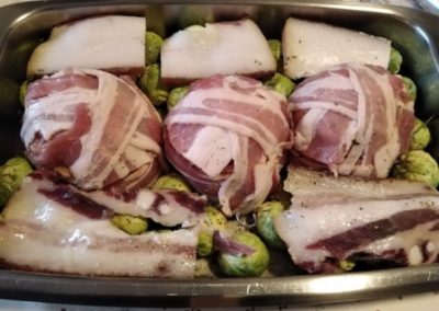Fólia alatt, szalonna szeletek társaságában 180′ sütjük kb. 30 – 40 percig (14), majd a fóliát levéve addig pirítjuk, amíg a szalonna eléri a kívánt színt (15).