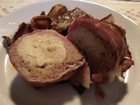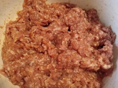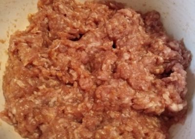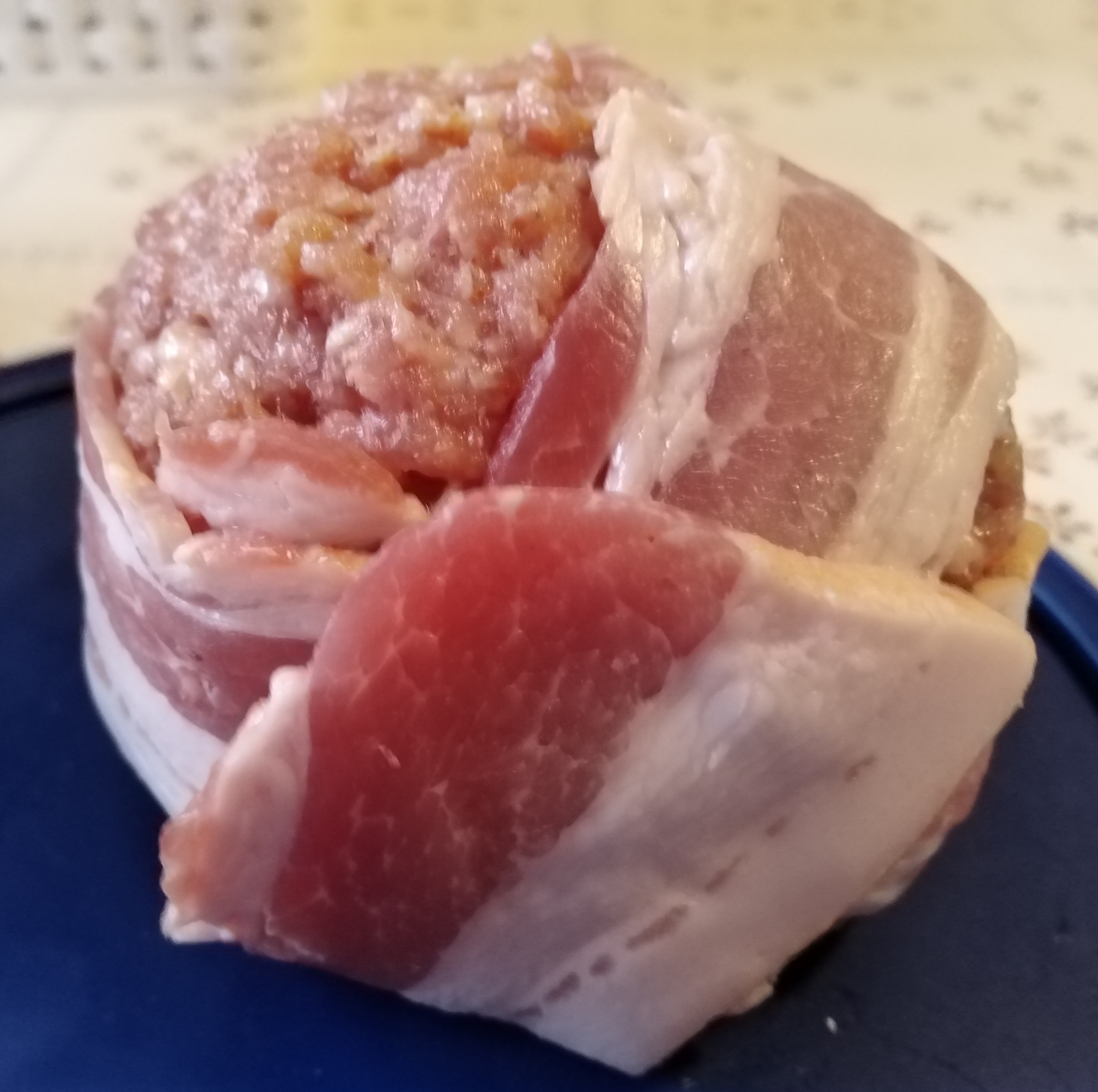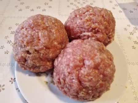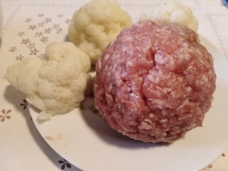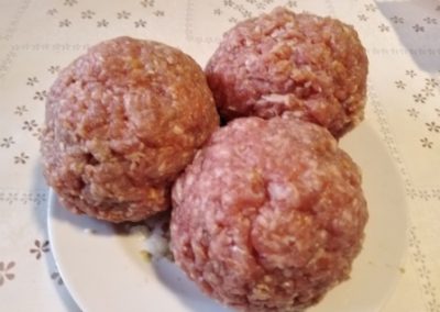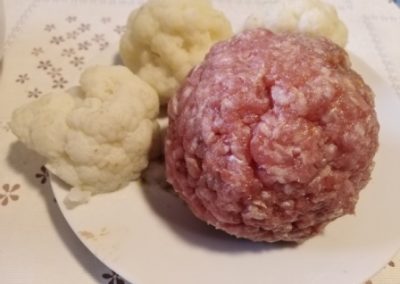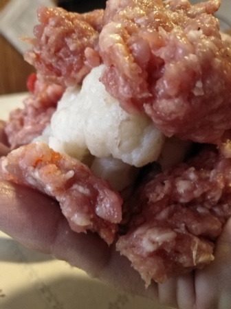 A karfiolrózsákat sós vízben félig megfőzzük, majd kitesszük hűlni (1). A darált húst beízesítjük (tojás, só, bors, kevés pirospaprika, 2, 3). A félig főtt karfiolrózsát a darált hússal bebugyoláljuk (4, 5, 6). Szép öklömnyi gombócok lesznek. A fél kg darált húsból kb. 3 – 4 golyót tudunk készíteni, a karfiol méretétől függően. 3 bacon szelettel körbetekerjük a golyókat (7, 8).