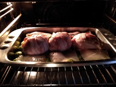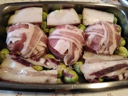 Ebben a fogásban minden megvan – zsír, fehérje, szénhidrát – a kellő mennyiségben. A fotókon kelbimbó is látható a tepsiben (11). Megtisztítjuk a kelbimbót, és 1 EK zsírral kikent tepsibe terítjük (10), sóval, borssal, egy kis lestyánnal meghintjük és közé tesszük a szalonna szeleteket (12), majd a golyókkal együtt tesszük lefóliázva a sütőbe (13). Néhány szem belefér köretként. Azért sütöttem mellé, mert aznap szalonnán pirított májat is készítettem, így a mellé is tudom köretnek kínálni.