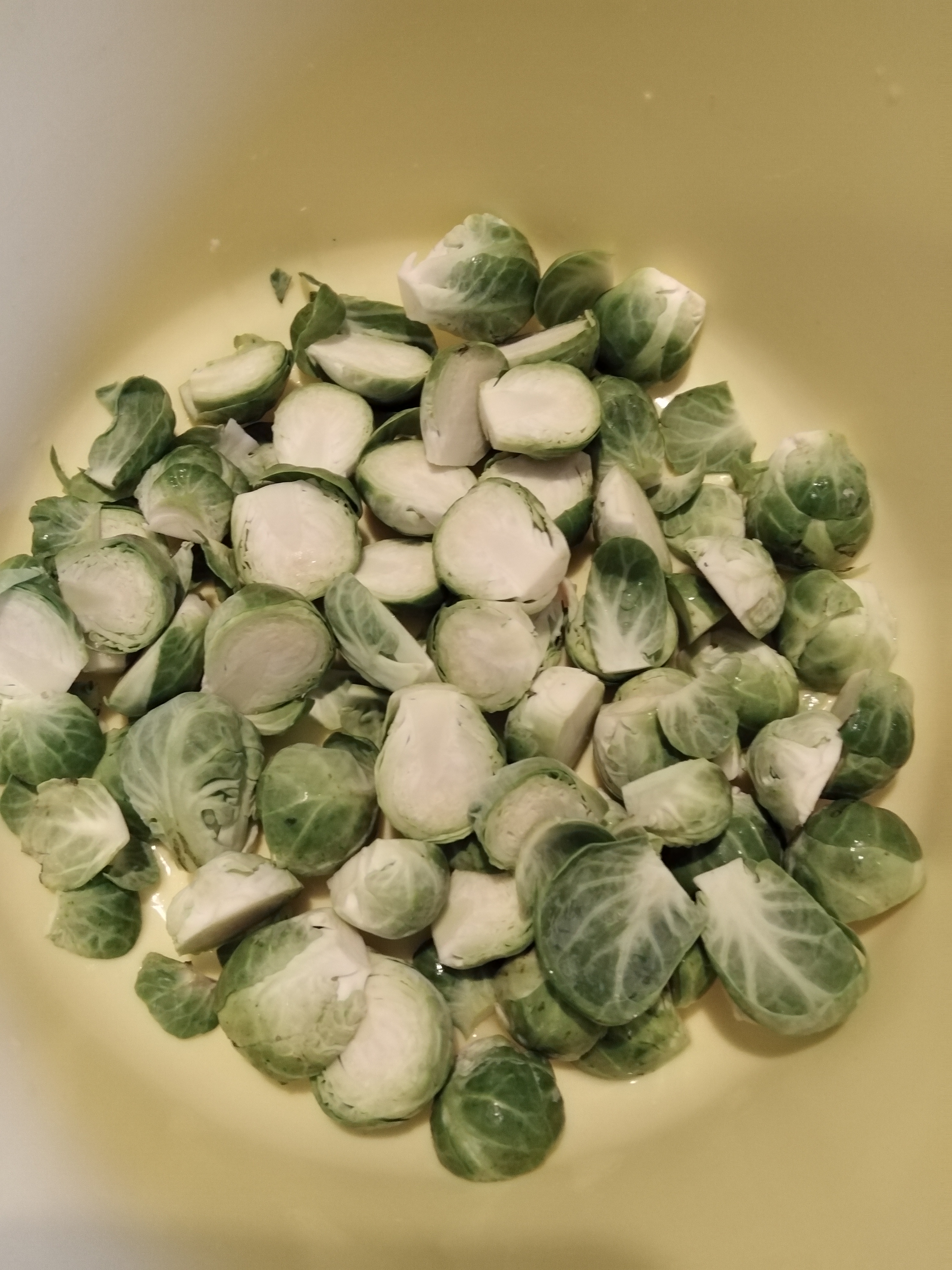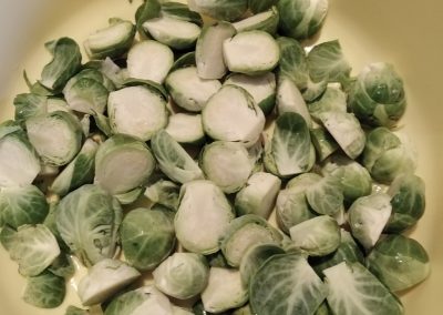 Megtisztítjuk az alapanyagokat. A kelbimbót félbe vágjuk. A gombát és a fokhagymát felszeleteljük.