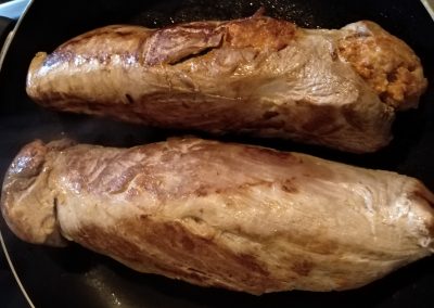 Egy teflon serpenyőben kérget sütünk a húsnak, majd tepsibe rakjuk és kb. 8 – 10 perc alatt 180′ megsütjük. Kivesszük, kicsit pihentetjük, majd középen félbevágjuk, hogy megállapítsuk, hogy átsült-e. Vigyázat! Ne szárítsd ki a húst! Ha már a pihenés alatt nem enged rózsaszín levet, akkor elkészült.