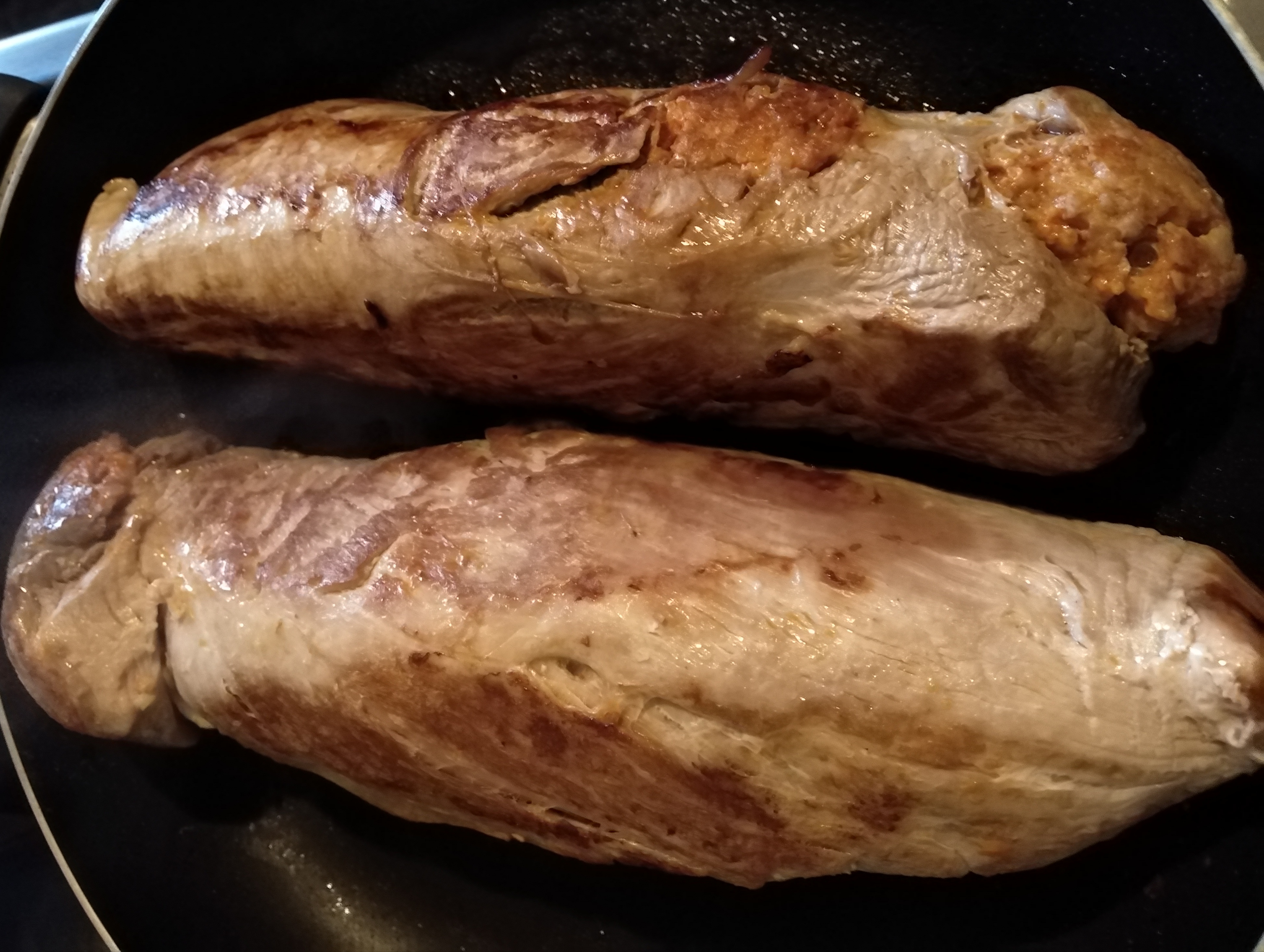 A szűzpecsenyét középen felszúrjuk, és egy sütnivaló kolbász tartalmát belenyomjuk, sózzuk, borsozzuk enyhén.