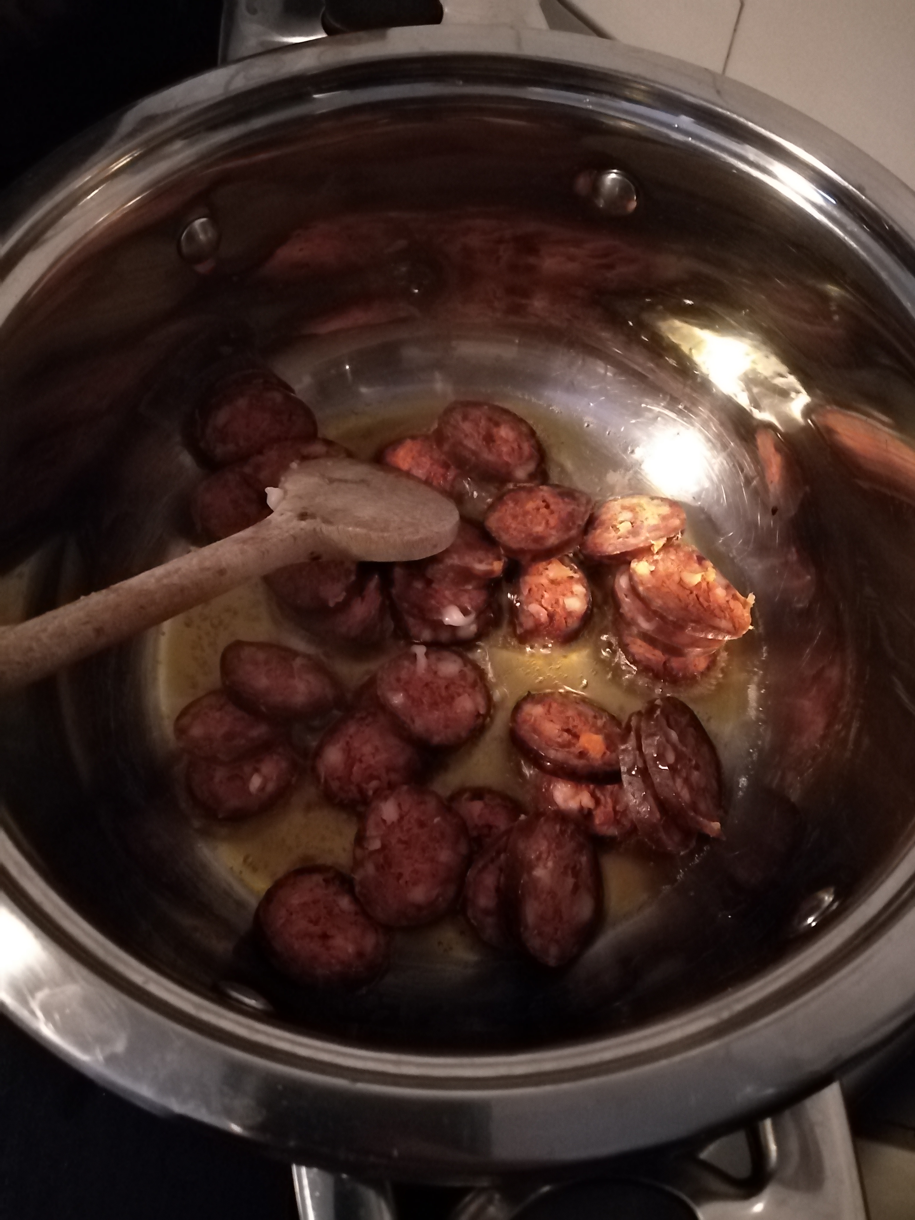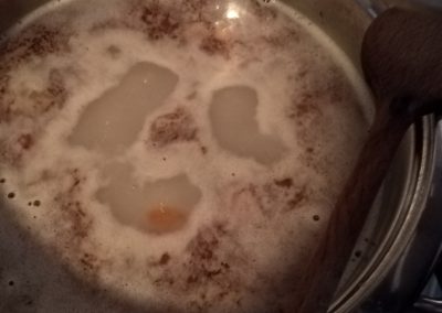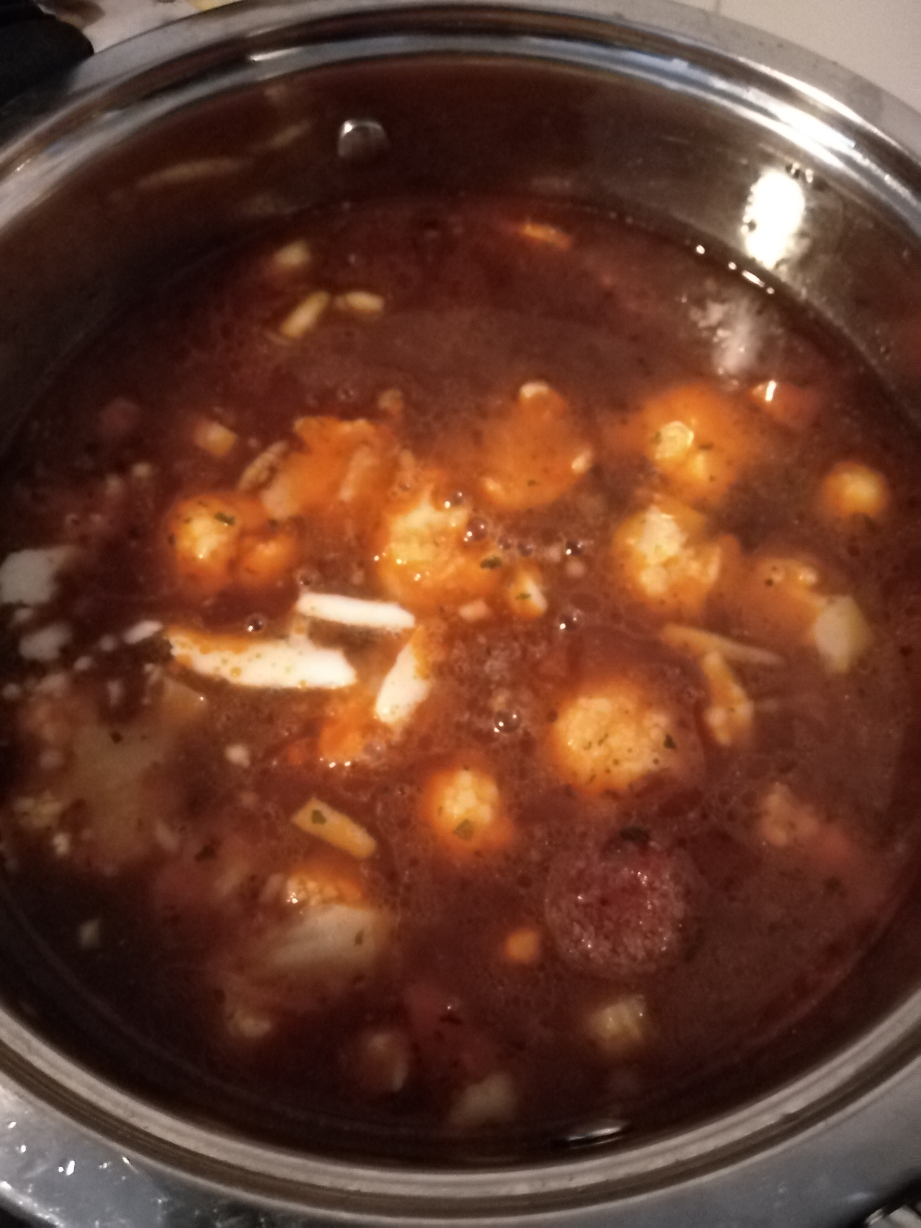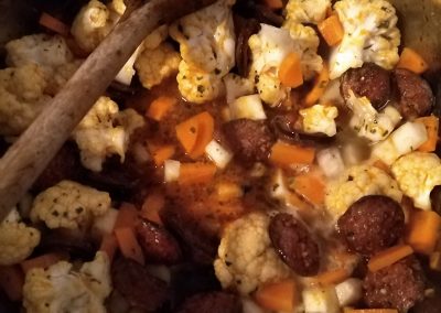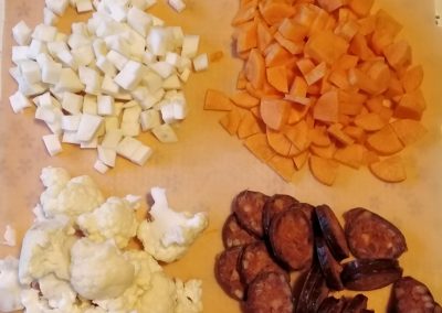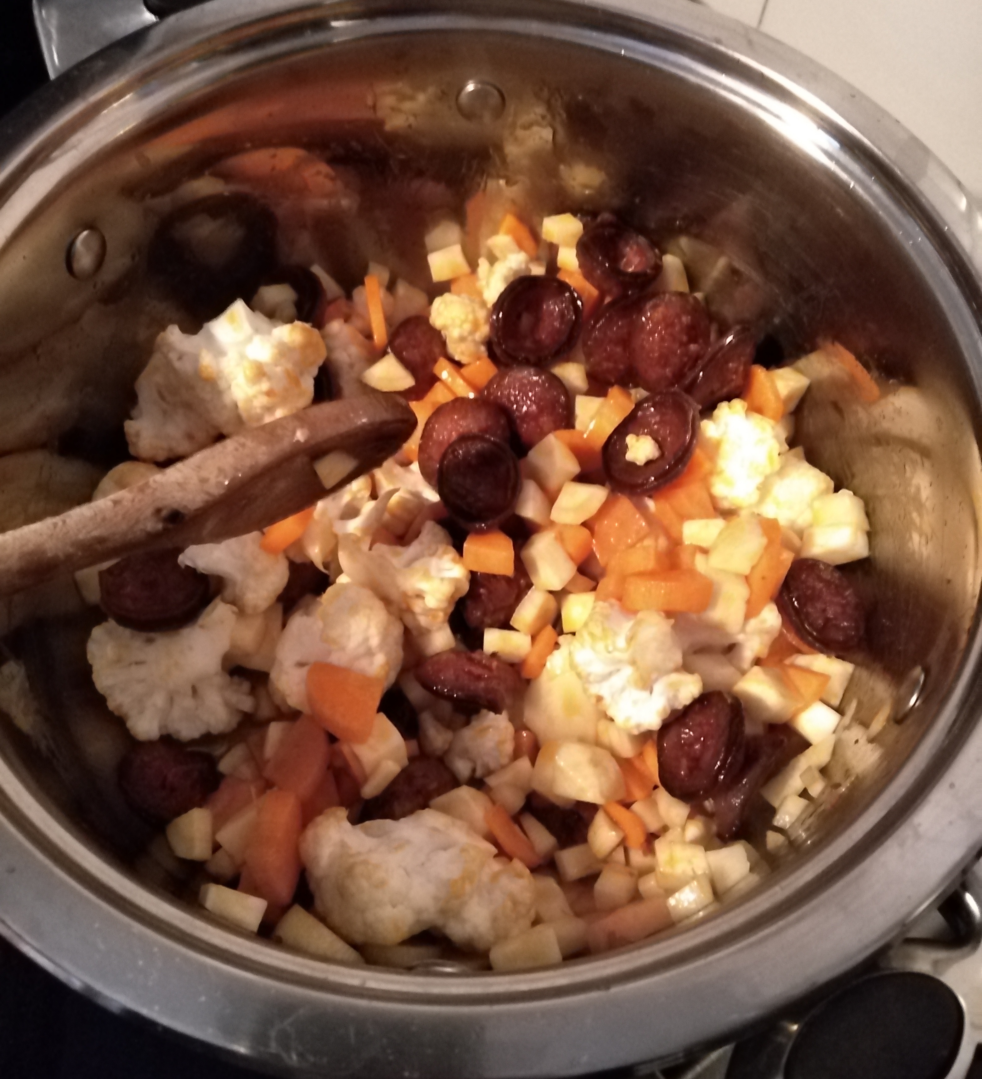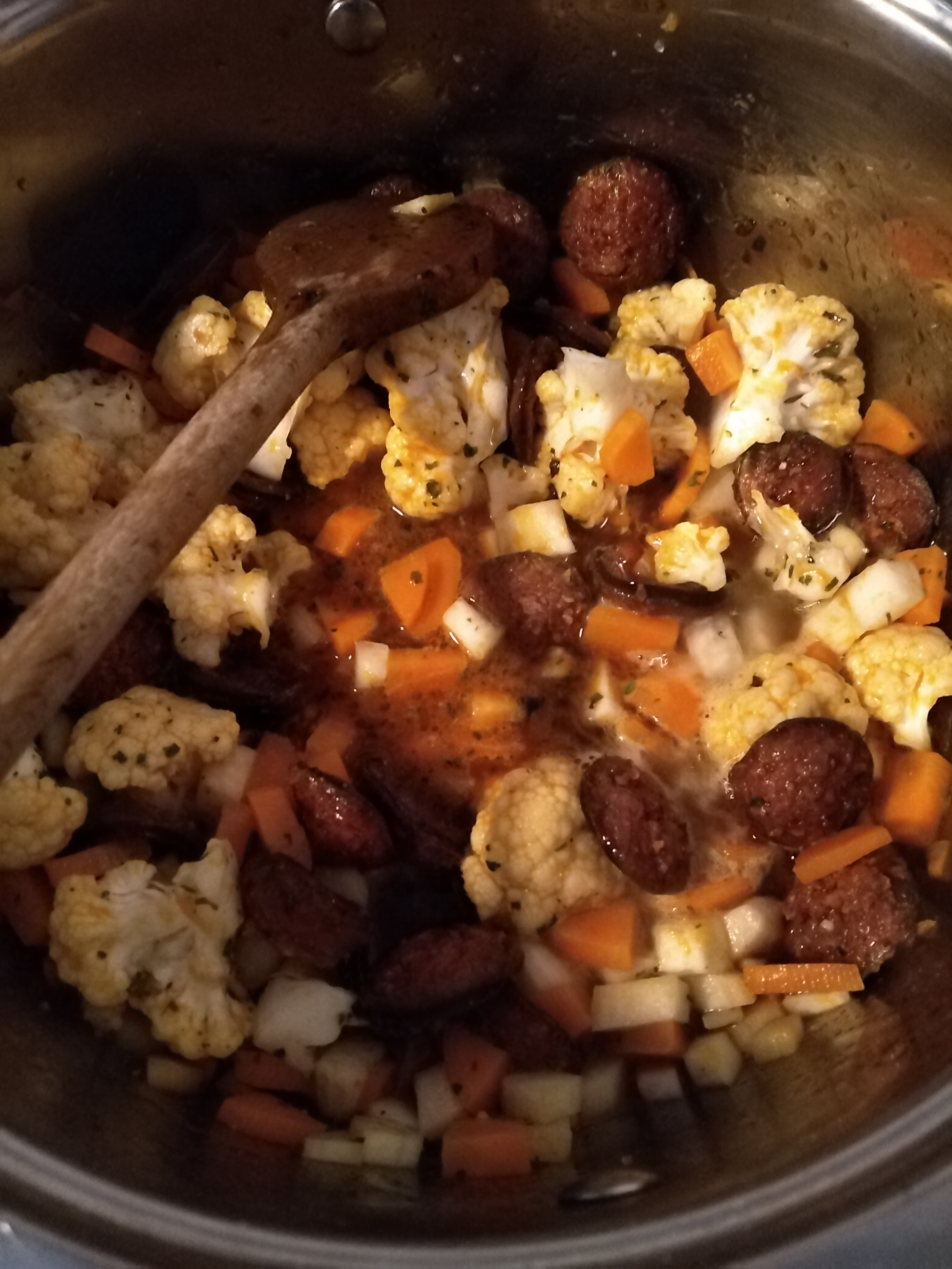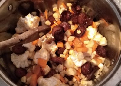 1 EK zsíron lepirítjuk a kolbászkarikákat (9). Rátesszük az apróra felkockázott zöldségeket és a kicsikre szedett karfiolrózsákat. Sózzuk, borsozzuk – ez alap, aztán ízlés szerint tehetünk rá lestyánt (10). Kevés vizet öntünk rá, hogy megfőjön a zöldség (11), majd a megmaradt húslével is felengedjük (8). Ha összerottyant, akkor egy kis lé segítségével összeturmixoljuk a bőrkepépet, és visszacsorgatjuk a levesbe, majd még 2 -3 percig hagyjuk főni (13).