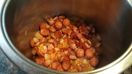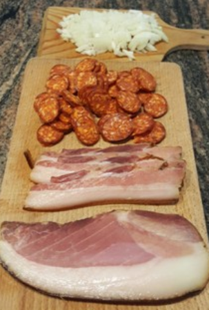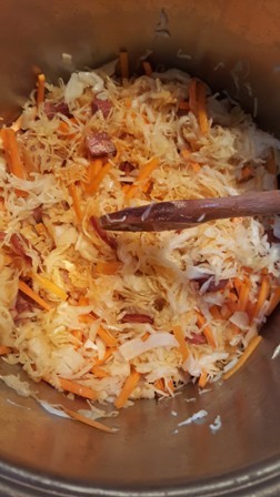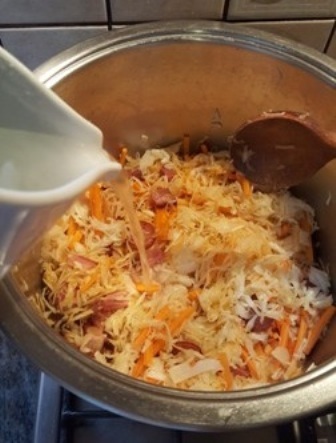 2 EK zsíron a szalonnát és a sonkát néhány percig pirítjuk, és mielőtt rádobnánk a felkarikázott kolbászt, a hagymával is összeforgatjuk (3). A pirospaprika nem szükséges, mert a kolbász kiengedi magából a színt, és ahol lehet, minél kevesebb paprikát használjunk. Ha sárgarépát is vágtunk össze, akkor most következzen, majd a kinyomkodott savanyú káposztát is ráhelyezzük végül (5).