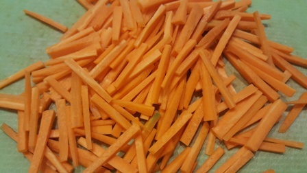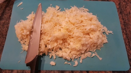 Az alapanyagokat összevágjuk (1, 4). A savanyú káposztát kissé átmossuk, és szintén apróra vágjuk (2).