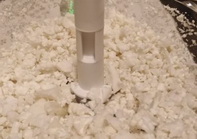 A karfiolt rózsáira szedjük, és egy konyhai aprítógéppel morzsásra aprítjuk (1, 2).