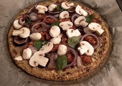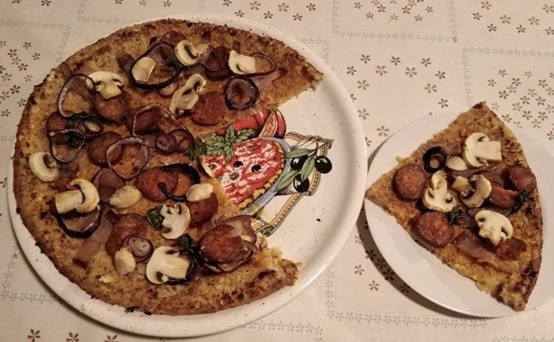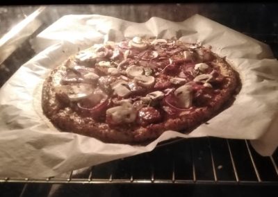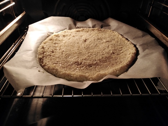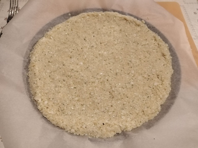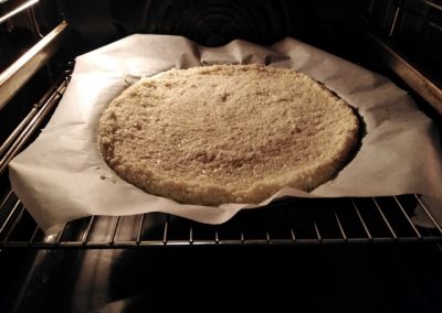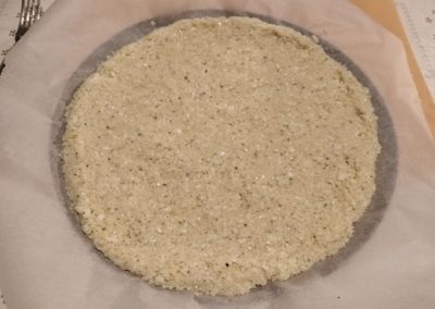 Nekem van ilyen pizzasütő lapom (10), de egy sima lapos tepsi is megteszi. Beleegyengetjük az összekevert alapmasszát, szépen pizzásra formázzuk, a szélét vastagabbra igazítjuk (11).