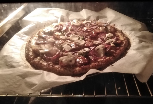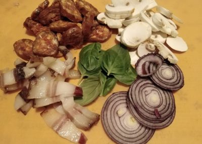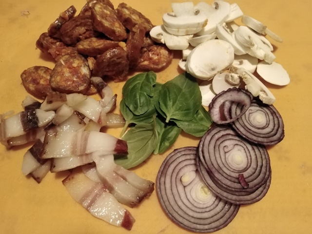 Ha már szép aranybarnás kezd lenni, kivesszük, és rászorjuk a kolbászt, szalonnát, gombát, lilahagymát (14), majd visszatesszük a sütőbe és még kb. 15 percig ugyanazon a hőfokon továbbsütjük (15).