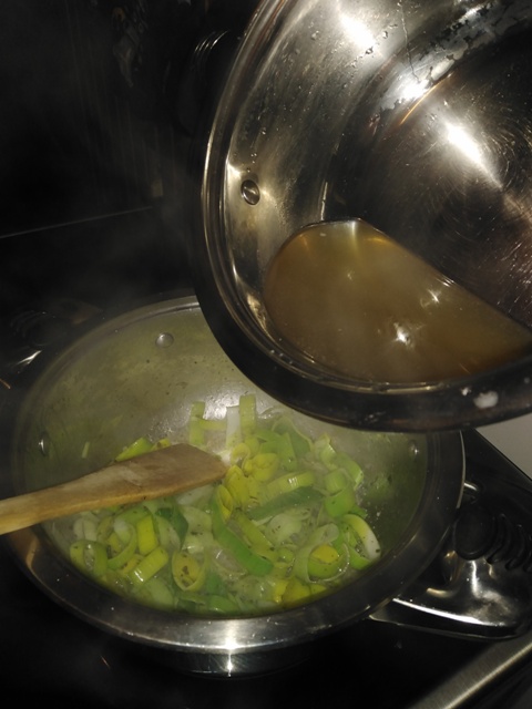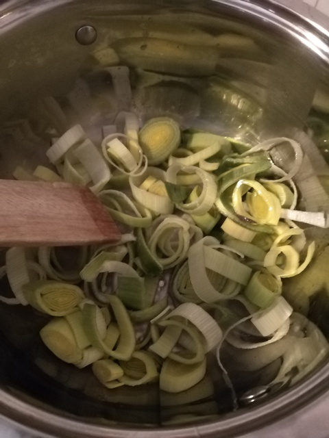 A zsírt felforrósítjuk, és rádobjuk a póréhagymát.