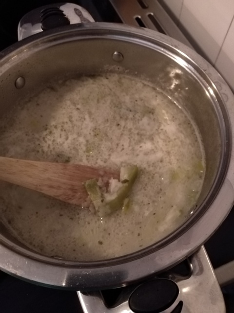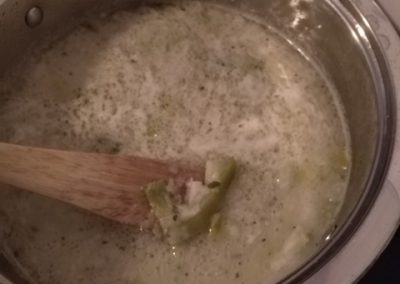 Amikor a hagyma már megpuhult, levesszük a tűzről, és összeturmixoljuk beletéve a felkockázott bőrkepépet is.