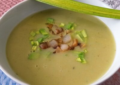 | Étel neve | PÓRÉHAGYMA KRÉMLEVES SZALONNAKOCKÁKKAL |