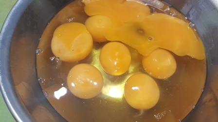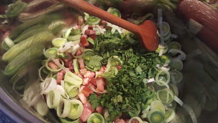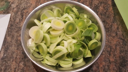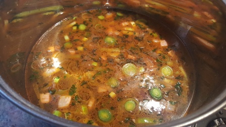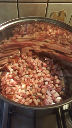 A felkockázott szalonnát a zsíron lepirítjuk (1), majd a felkarikázott póréhagymát(2) is rádobjuk. Sózzuk (enyhén!, mert a szalonna is sós), borsozzuk és egy kevés pirospaprikával meghintjük a színe kedvéért. Jöhet a felaprított zellerzöld (3), jól összeforgatjuk (4), és kb. 1,5 l vízzel felöntjük (5). Forrásnál visszavesszük a hőfokot, és kb. 15 percig főzzük, majd a felvert tojásokat belecsorgatjuk (6,7), amivel további 2-3 percet főzzük. (8)