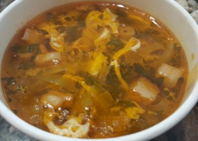 SZALONNÁS PÓRÉHAGYMALEVES CSURGATOTT TOJÁSSAL