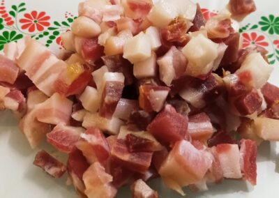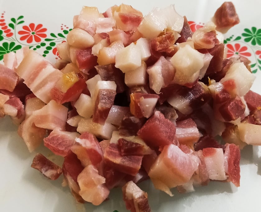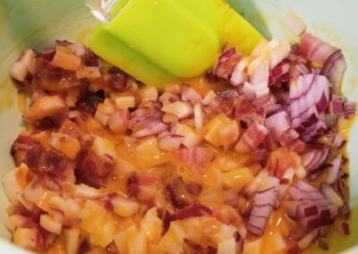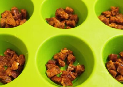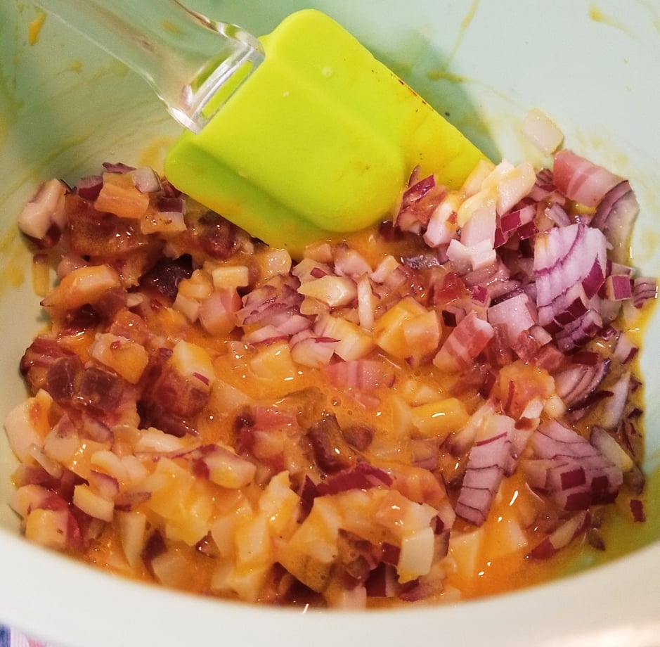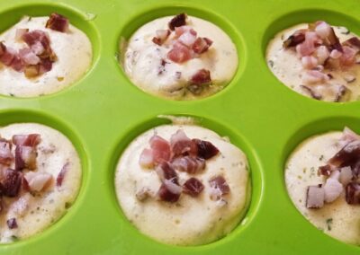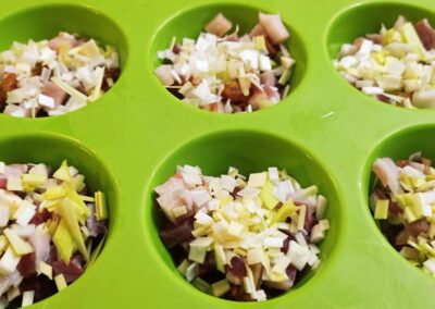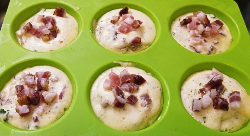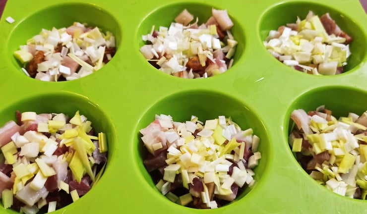 A muffinsütőben szétosztjuk a szalonnát, a hagymát, akár egy kis füstölt kolbászt is beleapríthatunk.