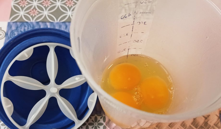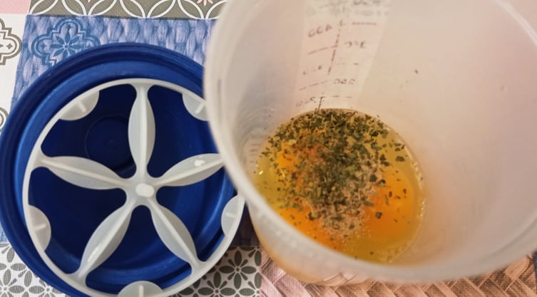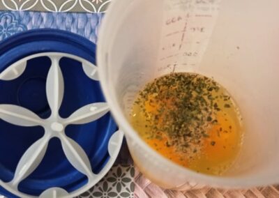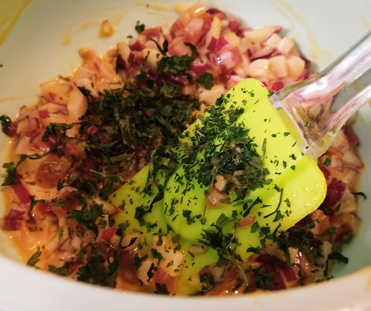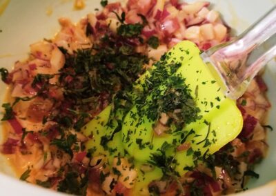 A hozzávalókat összeaprítjuk, a tojásokat fűszerezzük és felverjük.