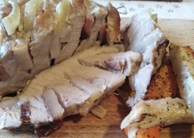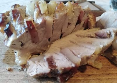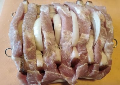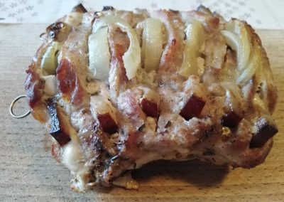SZALONNÁVAL, HAGYMÁVAL TŰZDELT KARAJ Mi kell hozzá? Karaj egyben Hagyma Füstölt szalonna Só, bors Elkészítés: Ujjnyi vastagságra bevagdossuk az egész karaj darabot vigyázva, hogy ne vágjuk át teljesen. Sózzuk, borsozzuk, majd szalonnával, hagymával megtűzdeljük.Sütőzacskóban vagy lefóliázva sütjük kb. 1 órát , majd felnyitjuk és tovább sütjük pirulásig. 1 2 3 4 5 Hozzászólás írása Válasz megszakításaAz e-mail címet nem tesszük közzé. A kötelező mezőket * karakterrel jelöltükHozzászólás * Név * E-mail cím * Honlap Kérjük, adja meg a választ számjegyekkel:11 − 9 =