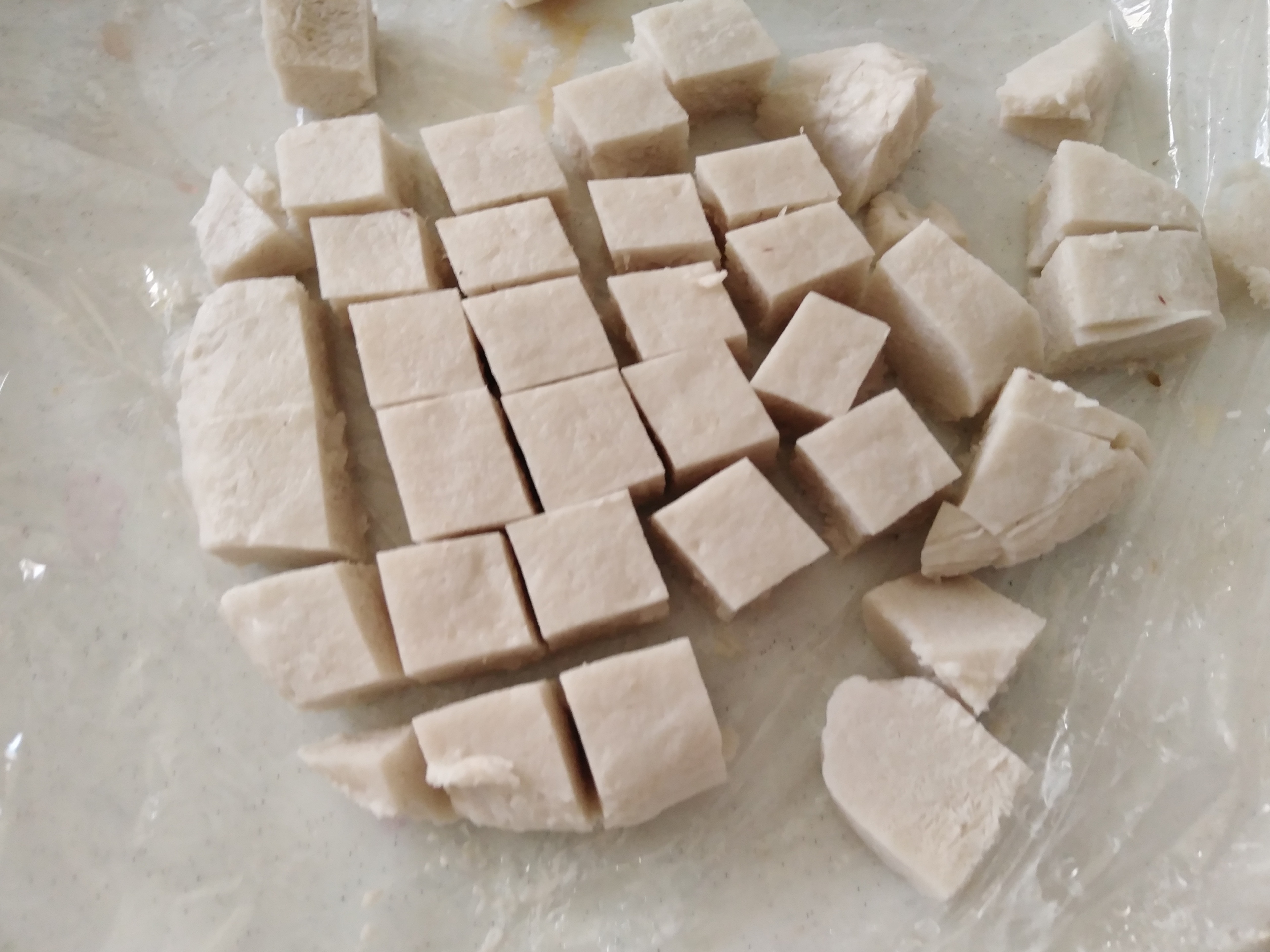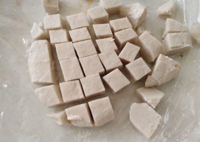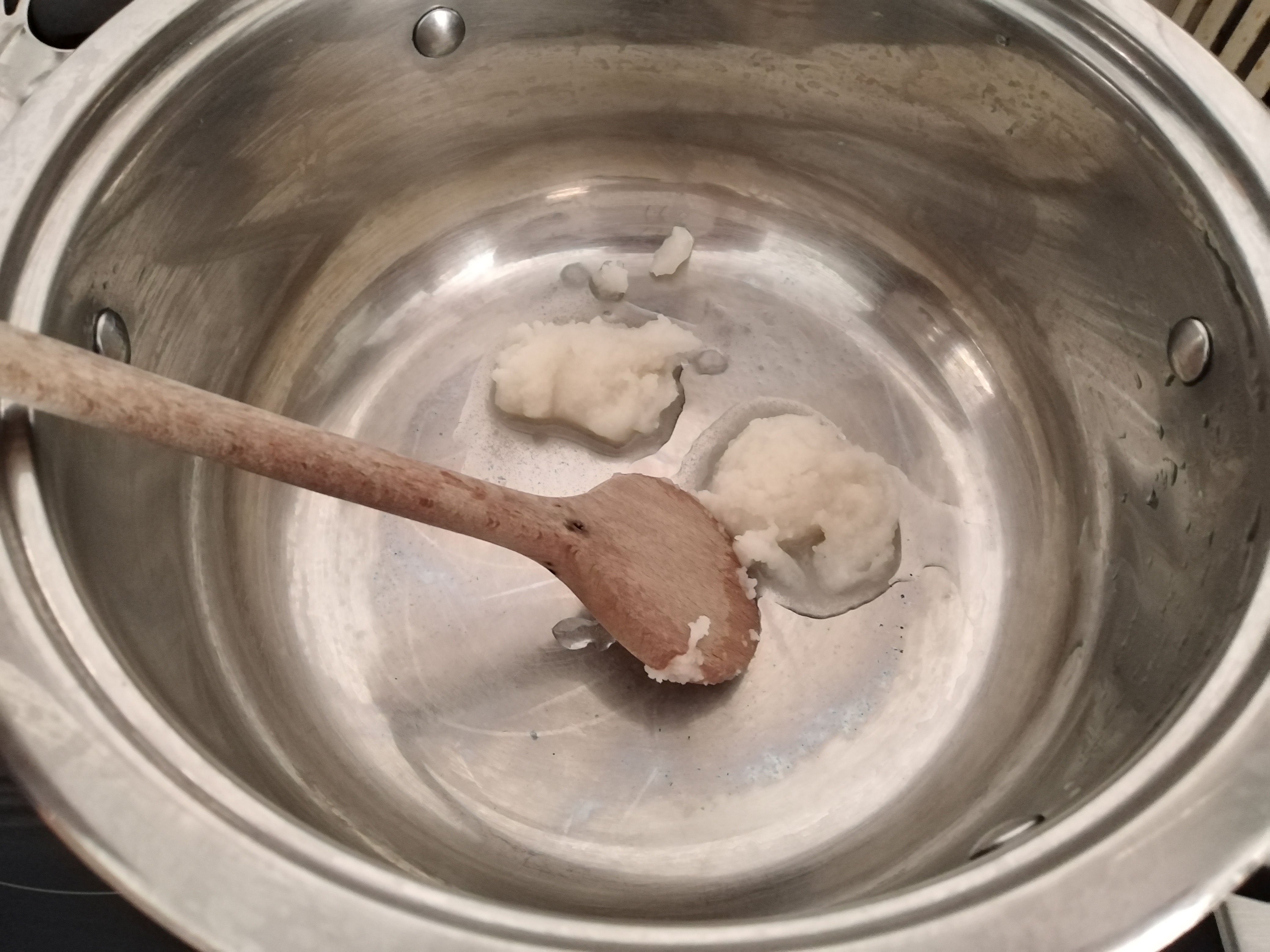 A zsírt felolvasztjuk (2), majd rádobjuk a felkockázott bőrkepépet (1, 3). Én mindíg elfelejtem kivenni a fagyasztóból, de sebaj. Amíg a főzést előkészítem, éppen elég neki, lehet vágni.