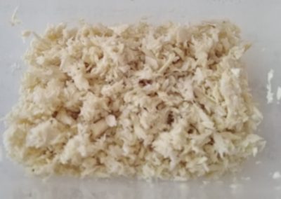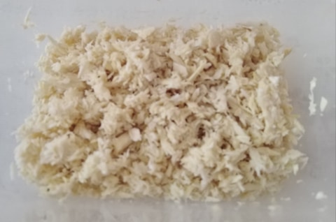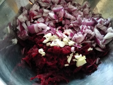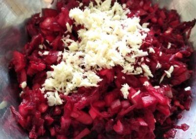A reszelő kis lyukán lereszeljük (4), majd a hagymát apróra vágjuk, és 2 gerezd fokhagymát szintén (5,6).