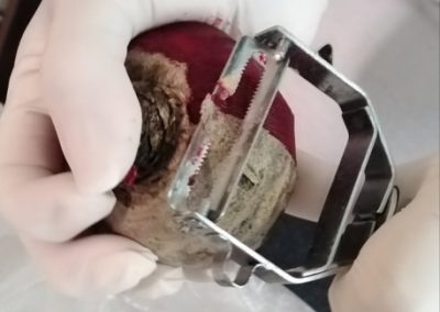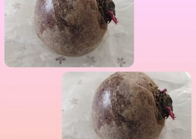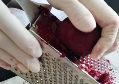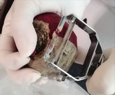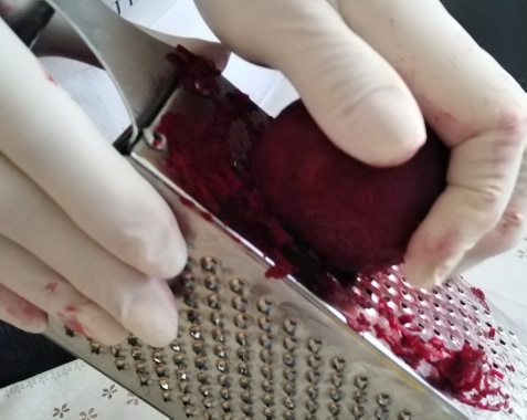 A cékla tisztításához ajánlott egy pár gumikesztyű használata (1). Meghámozzuk a céklákat (2,3).