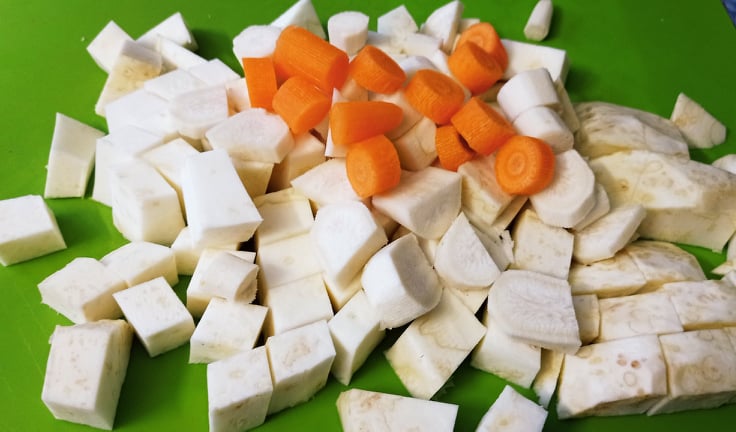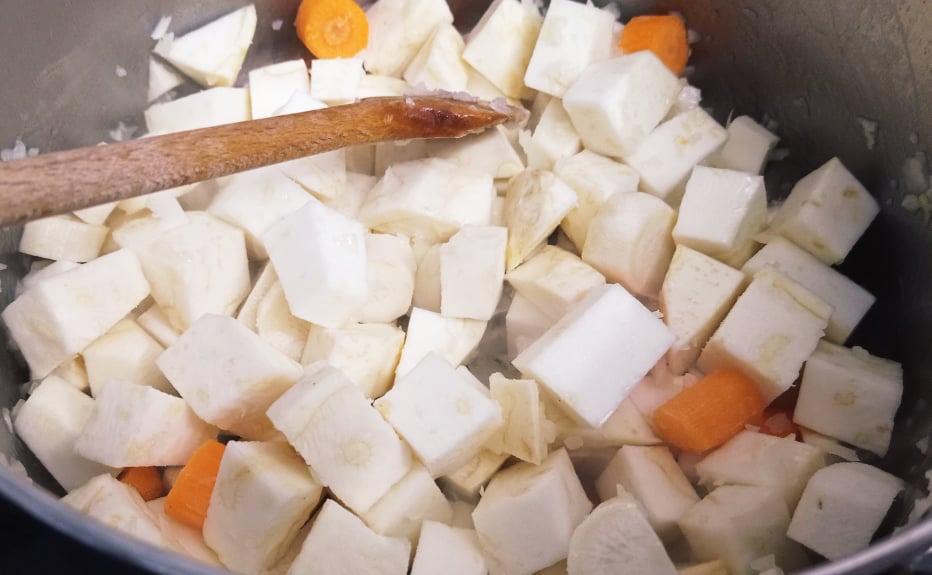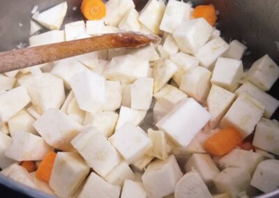 Megtisztítjuk a hozzávalókat. A zellert kockákra vágjuk, a hagymát felaprítjuk, a zsíron üvegesre pároljuk és rádobjuk a zellerkockákat.