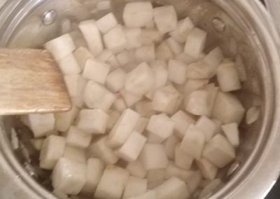 A zellert megtisztítjuk, és kockákra vágjuk. A hagymát szintén felaprítjuk.