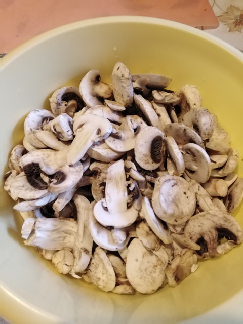 A gombát megtisztítjuk és szeletekre vágjuk. (1) (Egy tojás szeletelő segítségünkre lehet ebben.)
